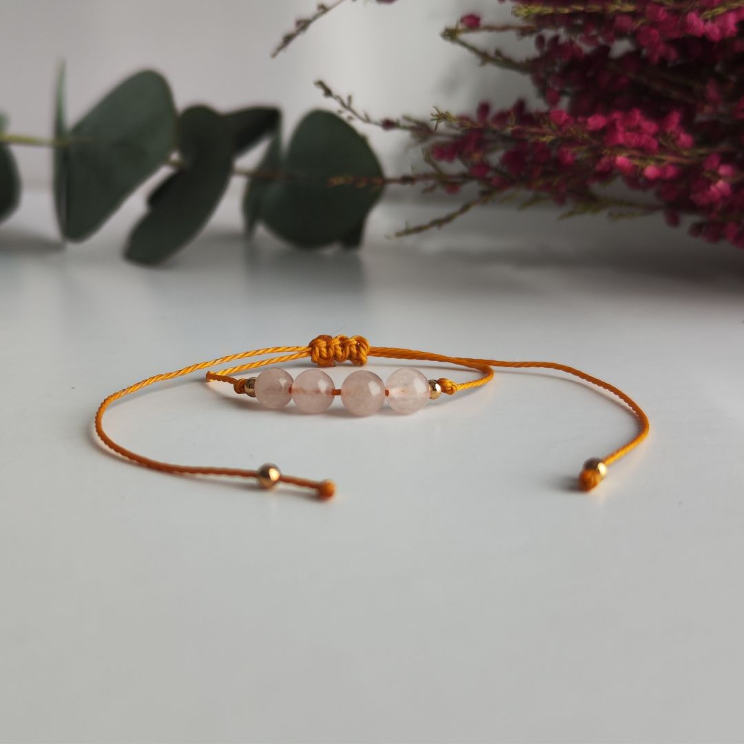 - Pulsera de Cuarzo Rosa: El cuarzo rosa es la piedra del amor y la fertilidad, ayudando a canalizar energías positivas y fortalecer el vínculo con tu pareja.